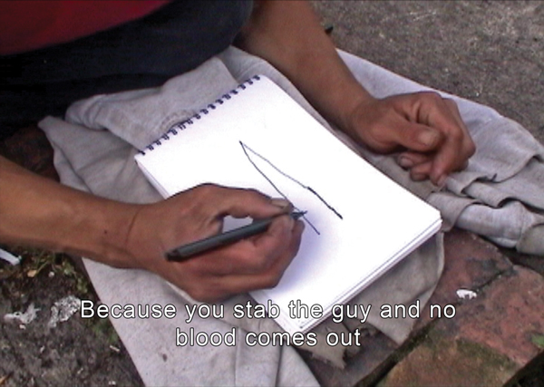 Edwin Sánchez trer inn i og dokumenterer byens brutale virkelighet i flere av sine prosjekter. Via videoarbeider og fotografier tar Sanchez for seg samfunnets ytre randsone og dets aktiviteter og personligheter. Kunstneren forblir ikke bare en ekstern betrakter, men går selv inn i situasjonene som utfolder seg. Denne nærheten og tilstedeværelsen kommer ofte til uttrykk, som i videotriologien Knife Lessons (2006-07) , hvor han går i skole hos en av byens gateranere for å stifte nærmere bekjentskap med hvordan det perfekte ransvåpenet, kniven, både skapes og benyttes på enklest og best mulig måte. Videoarbeidet fremstår med en didaktisk karakter, men innehar både en alvorlig, samt mer humoristisk undertone som er gjenkjennelig i mange av Sánchez arbeider.
